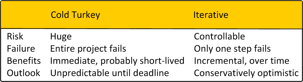 The smaller the increment, the smaller the risk and the smaller the gain. Our MS Access developers will be taking an iterative, low-risk approach.